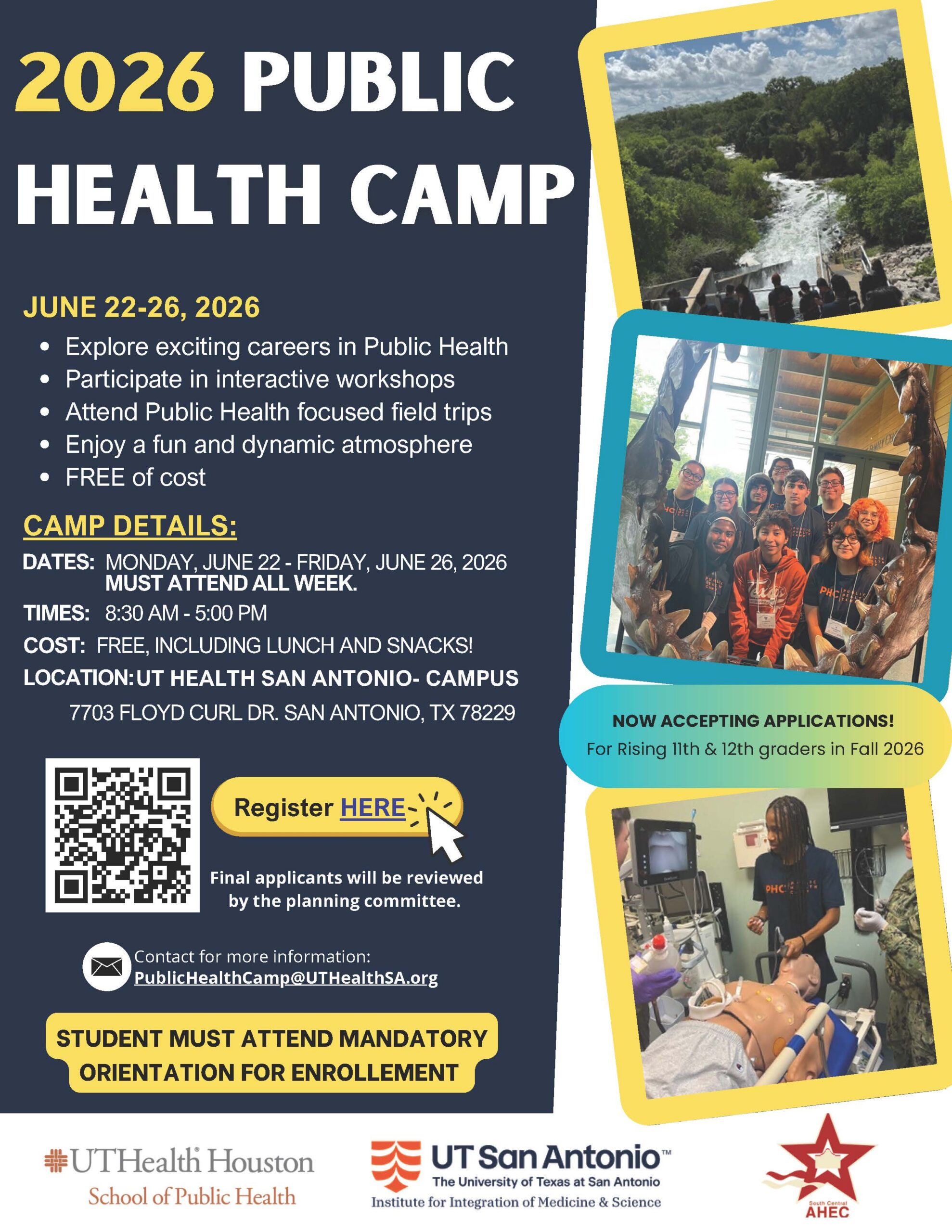 Since 2011, the Institute for Integration of Medicine & Science, South Central Area Health Education Center (AHEC), UTHealth Houston School of Public have partnered to plan and deliver a free week long, summer Public Health Camp for area high school students. The overall goal for the camp is to increase the future public health and biomedical workforce capacity by building student awareness and knowledge of population health related professions. Throughout the week, the Public Health Camp identifies and focuses on the 10 Essential Public Health Services that provide the core public health functions of assessment, policy development, and assurance.